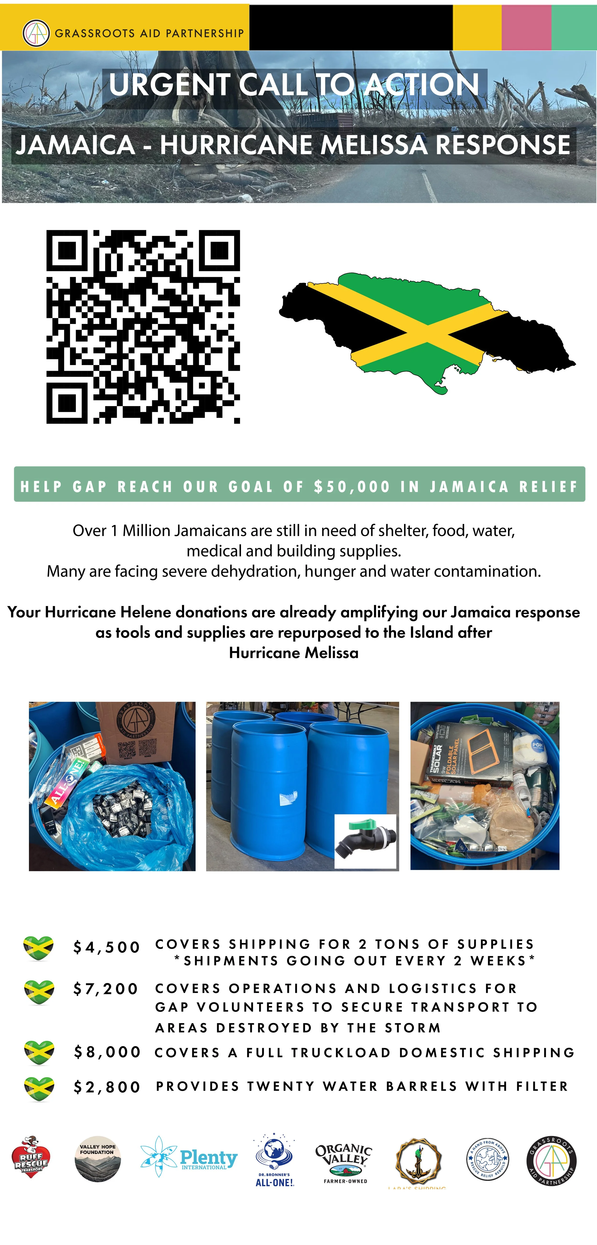 Hurricane Melissa hit Jamaica as the third strongest storm ever recorded in the Atlantic. GAP has sent several pallets of relief supplies to the island, including tools, tarps, boots, soap, and solar kits.